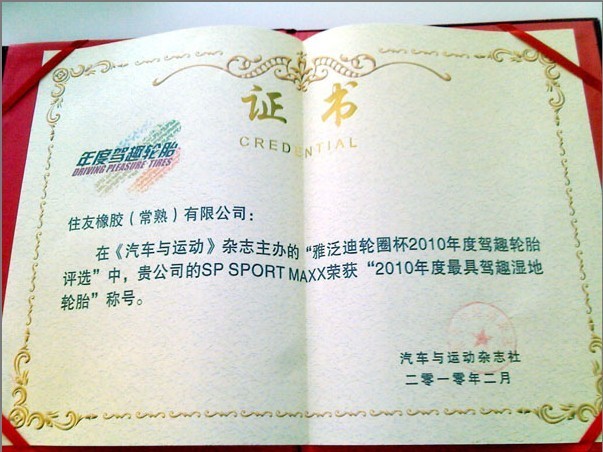??????? 2010年1月,鄧祿普參加了《汽車與運(yùn)動(dòng)》雜志主辦的“雅泛迪輪圈杯2010年度駕趣輪胎頒獎(jiǎng)典禮”。其中,鄧祿普SP SPORT MAXX輪胎榮獲“2010年度駕趣輪胎”稱號。
