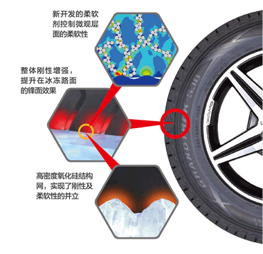 由二氧化硅、高分子化合物、柔軟劑組成,通過特定的分子結(jié)構(gòu)組合,能夠非常有效的發(fā)揮橡膠整體的柔軟性,其中高密度氧化硅的使用實(shí)現(xiàn)了剛性及柔軟性的并立,從而擁有比普通輪胎更大的摩擦力與耐磨性,確保其在極低溫度下仍保持柔韌質(zhì)地,為您的行車安全提供最佳保障。
