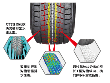 即采用立體式刀片花紋溝槽設(shè)計(jì),使花紋片溝槽間隙變薄25%,同時(shí)減少花紋片之間的間隙,目的是抑制花紋塊的傾倒。鋒利的溝槽邊緣能更好地抓住地面,同時(shí)也進(jìn)一步增加了輪胎和冰面的接觸面積,改善座駕直線行駛時(shí)的牽引力及彎道行駛時(shí)的穩(wěn)定性,讓您在征服嚴(yán)冬的路上操控自如。