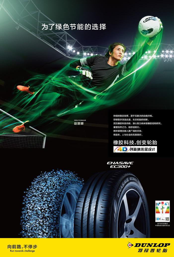 中國女子足球運動員趙麗娜呈現(xiàn)“持續(xù)的穩(wěn)定發(fā)揮,源于無數(shù)次的自我淬煉” 的精神面貌,正如鄧祿普矢志輪胎的創(chuàng)新,為了綠色節(jié)能的選擇,推出環(huán)保型輪胎ENASAVE EC300+,將環(huán)保理念駛?cè)敫鼜V闊的天地,締造車、人與社會的無限美好。