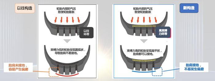 其次,該款產(chǎn)品的胎面橡膠優(yōu)化了橡膠種類和補強材料(炭黑)的使用量,盡可能地抑制了磨損。通過進一步地降低橡膠發(fā)熱性,實現(xiàn)降低滾阻從而減少油耗。另外,胎面內(nèi)部采用新的結(jié)構(gòu)——高束縛力環(huán)帶,提升胎面剛性,并使胎面更加扁平化,從而實現(xiàn)胎肩牢牢接地,提升耐偏磨性能。