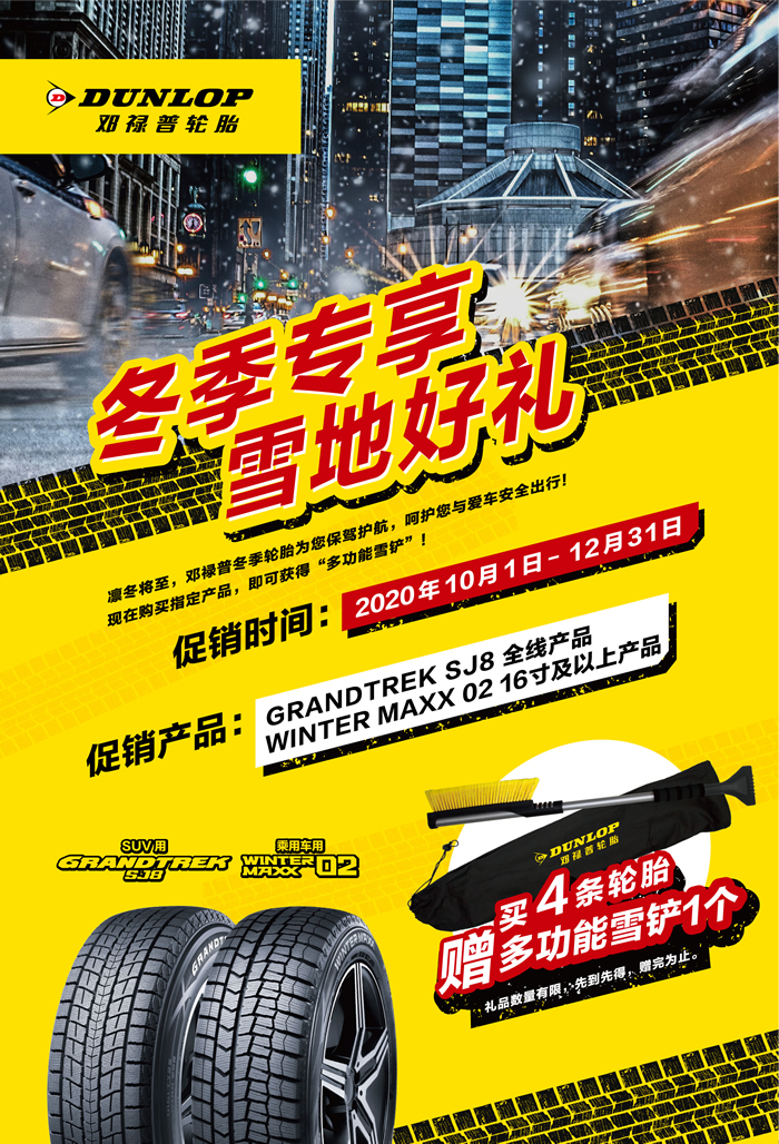 鄧祿普輪胎現(xiàn)推出冬季胎特惠活動(dòng):2020年10月1日至12月31日,凡購(gòu)買鄧祿普GRANDTREK SJ8全線產(chǎn)品,或鄧祿普WINTER MAXX 02 16寸及以上產(chǎn)品,買4條即送多功能雪鏟1個(gè)。禮品數(shù)量有限,先到先得,贈(zèng)完為止。