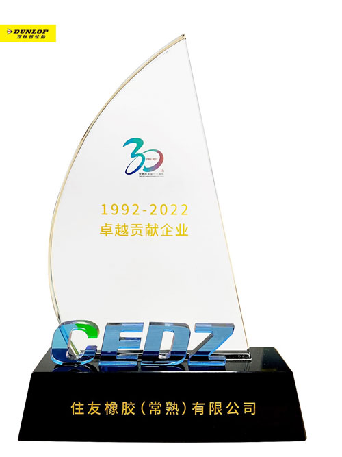 同時(shí),2022年恰逢住友橡膠集團(tuán)進(jìn)軍中國(guó)市場(chǎng)20周年,企業(yè)榮獲《1992~2022常熟經(jīng)開(kāi)區(qū)卓越貢獻(xiàn)企業(yè)獎(jiǎng)》(圖1)。該獎(jiǎng)項(xiàng)是對(duì)30年來(lái)對(duì)開(kāi)發(fā)區(qū)的社會(huì)經(jīng)濟(jì)發(fā)展做出貢獻(xiàn)的企業(yè)的肯定和激勵(lì)。