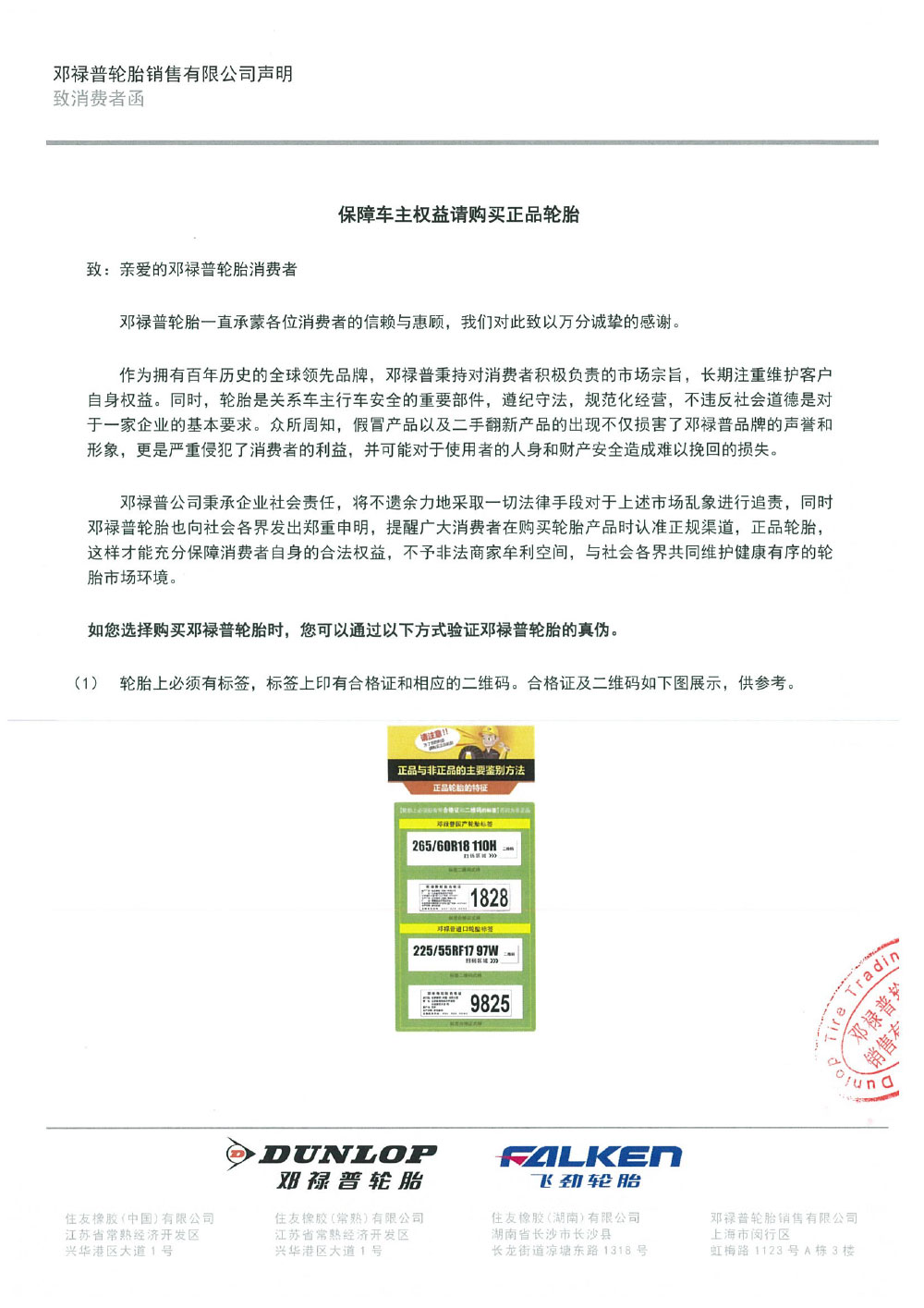 作為擁有百年歷史的全球領(lǐng)先品牌,鄧祿普秉持對消費者積極負(fù)責(zé)的市場宗旨,長期注重維護(hù)客戶自身權(quán)益。同時,輪胎是關(guān)系車主行車安全的重要部件,遵紀(jì)守法,規(guī)范化經(jīng)營,不違反社會道德是對于一家企業(yè)的基本要求。眾所周知,假冒產(chǎn)品以及二手翻新產(chǎn)品的出現(xiàn)不僅損害了鄧祿普品牌的聲譽和形象,更是嚴(yán)重侵犯了消費者的利益,并可能對于使用者的人身和財產(chǎn)安全造成難以挽回的損失。