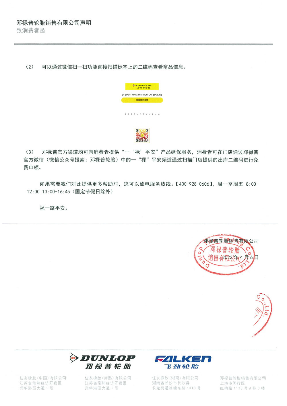 (3)鄧祿普官方渠道均可向消費者提供“一‘祿’平安”產(chǎn)品延保服務(wù),消費者可在門店通過鄧祿普官方微信(微信公眾號搜索:鄧祿普輪胎)中的一“祿”平安頻道通過掃描門店提供的出庫二維碼進(jìn)行免費申領(lǐng)。