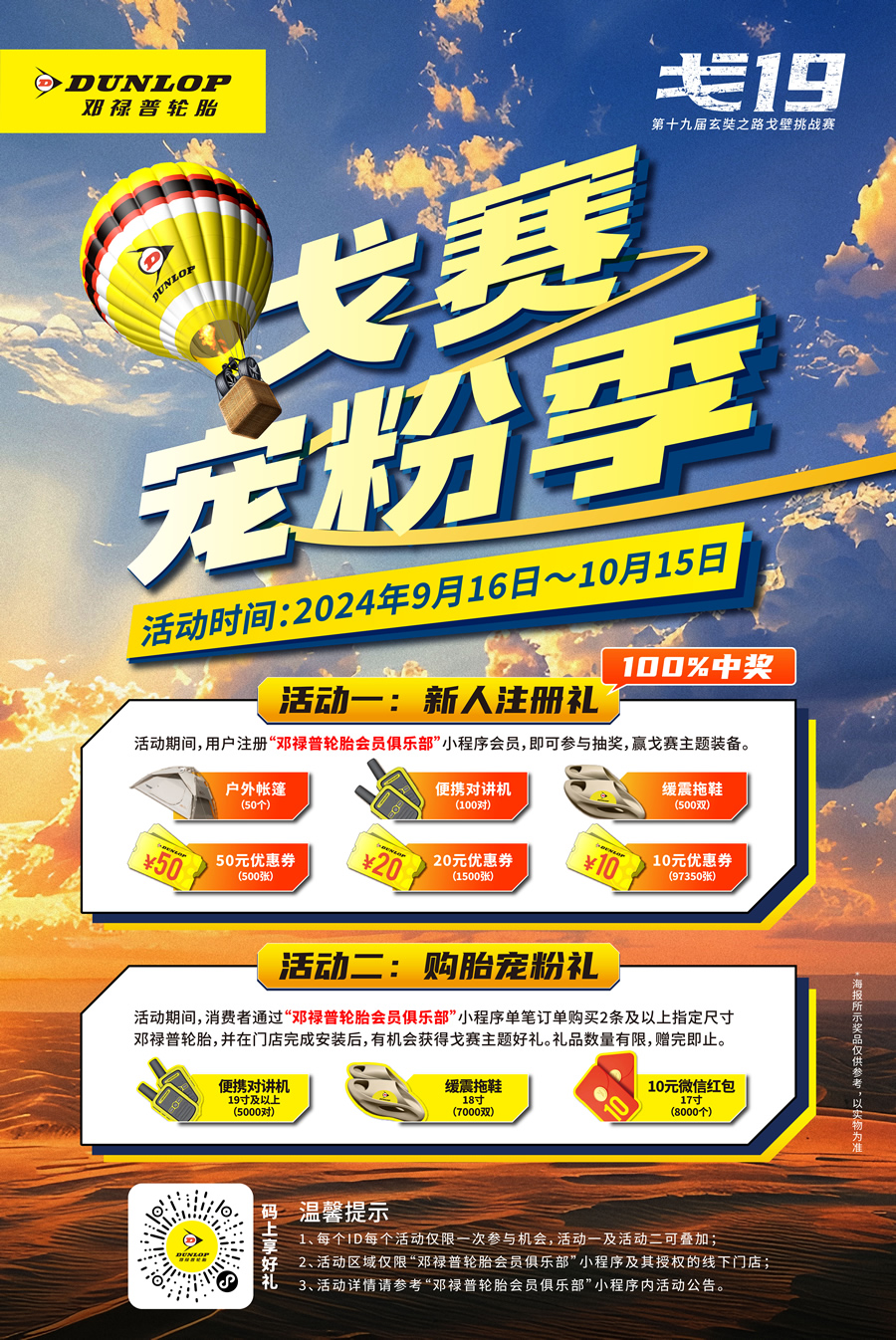 挑戰(zhàn)前路,向戈而行!鄧祿普為展示其“安全安心,一路守護(hù)”的品牌主張,還發(fā)布了雙重福利。9月16日-10月15日,首次注冊(cè)“鄧祿普會(huì)員俱樂(lè)部”小程序的新會(huì)員,可參與抽獎(jiǎng),贏取第十九屆玄奘之路戈壁挑戰(zhàn)賽專屬裝備;通過(guò)“鄧祿普會(huì)員俱樂(lè)部”小程序購(gòu)買指定輪胎,并在鄧祿普門店完成安裝后即有機(jī)會(huì)獲得戈賽主題好禮。專屬裝備和好禮包含優(yōu)惠券、緩震拖鞋、便攜對(duì)講機(jī)、戶外帳篷等。