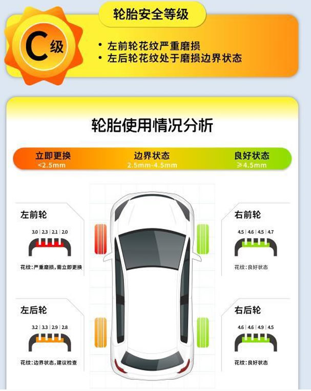 據(jù)輪胎花紋深度國(guó)家法定標(biāo)準(zhǔn)規(guī)定,輪胎花紋深度大于4.5mm被視為良好狀態(tài);2.5-4.5mm被視為臨界狀態(tài);一旦花紋深度低于2.5mm,輪胎便需要更換。值得注意的是,1.6mm為輪胎花紋的國(guó)家法定標(biāo)準(zhǔn),當(dāng)花紋深度達(dá)到極限值1.6mm時(shí),車輛必須立即更換輪胎,以確保行車安全。