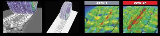 通過(guò)雪地模擬,觀察到胎面花紋在雪地駛過(guò)后留下的印跡的狀態(tài)。從而證明了胎面中央部對(duì)于輪胎的雪地性能有非常大的關(guān)系。繼而通過(guò)雪柱密度模擬,分析各種溝槽形狀,開(kāi)發(fā)了具有很強(qiáng)雪地性能的輪胎。